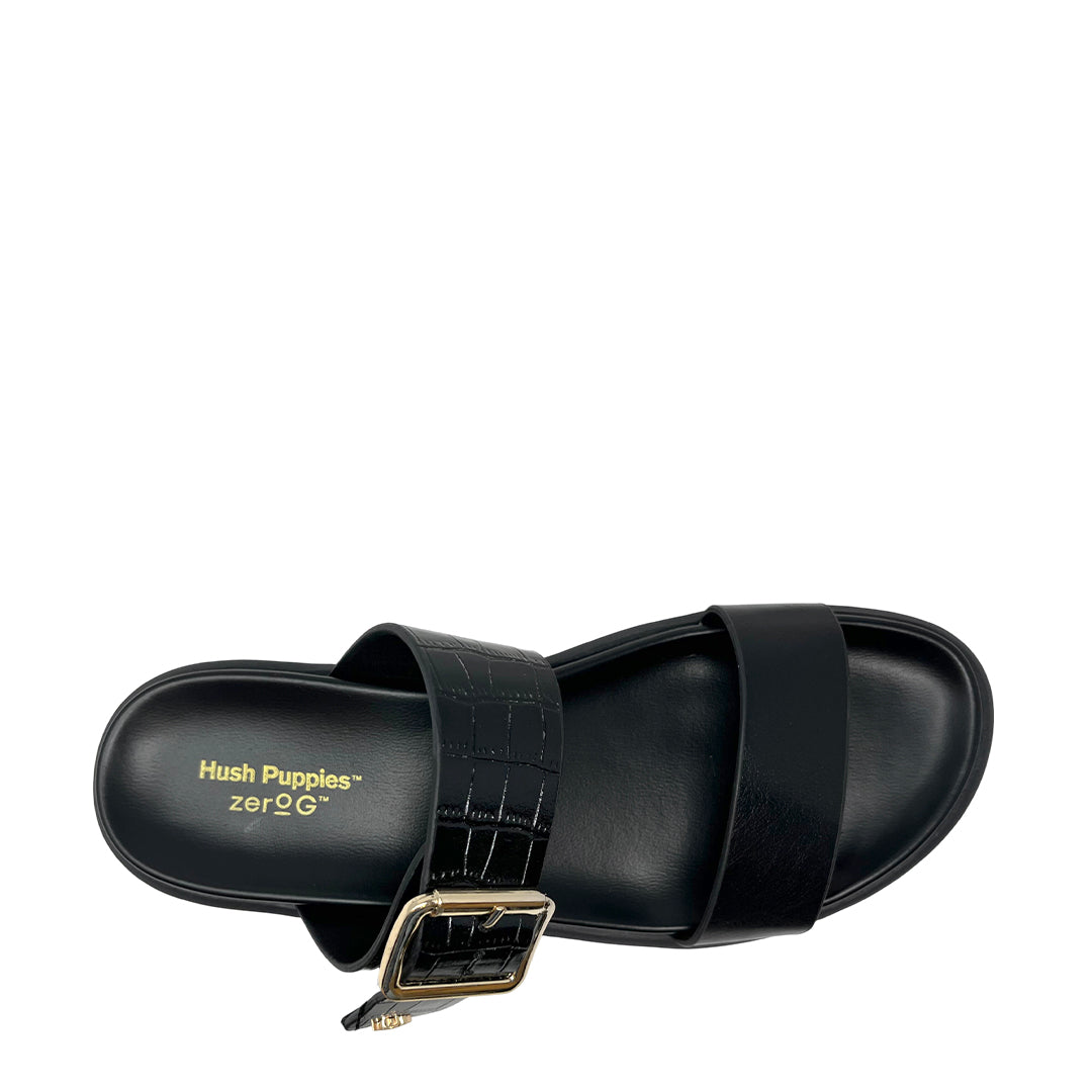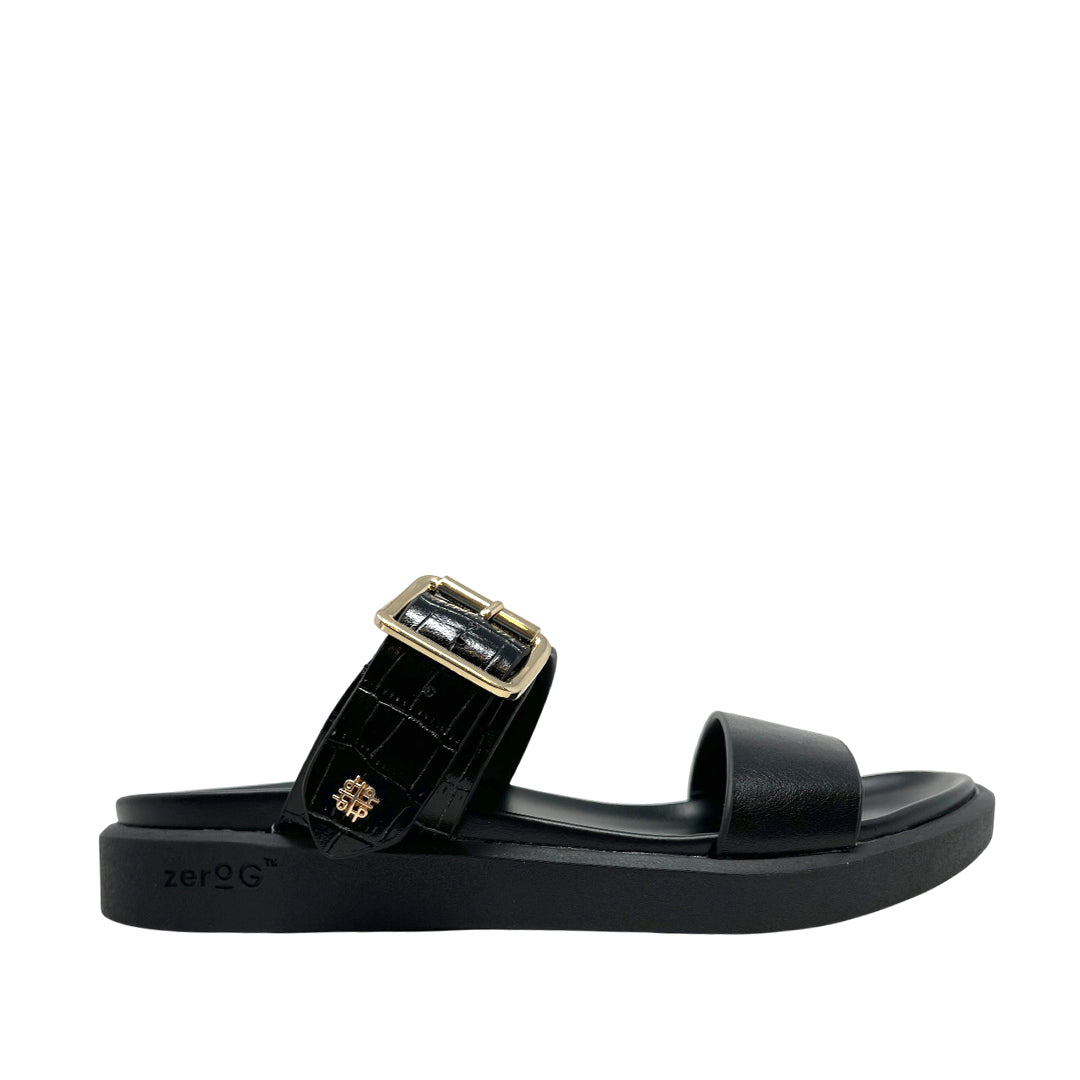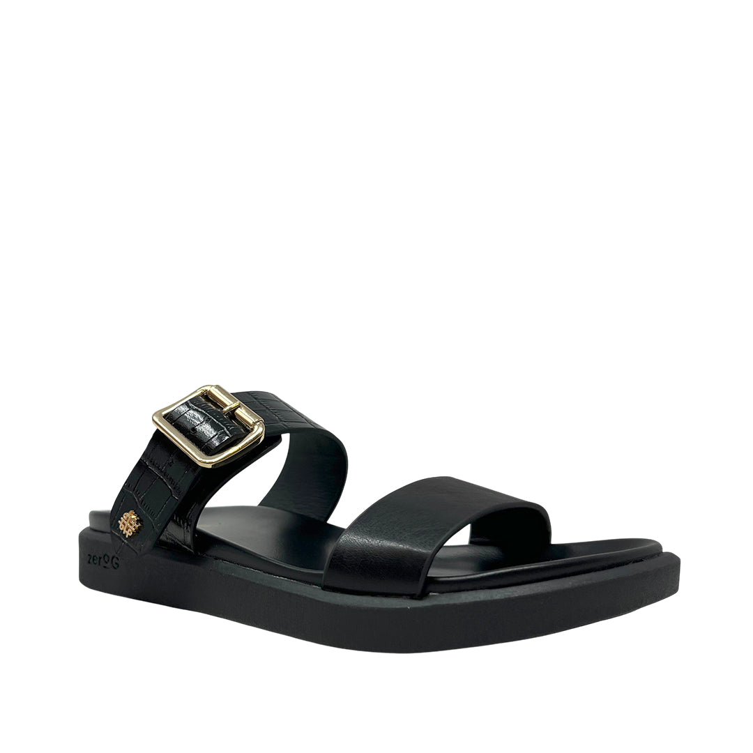 Sandalias flats Valia para mujer color negro, en cuero con Zero G. Amortiguación liviana y plantilla de látex de alta memoria para confort prolongado.